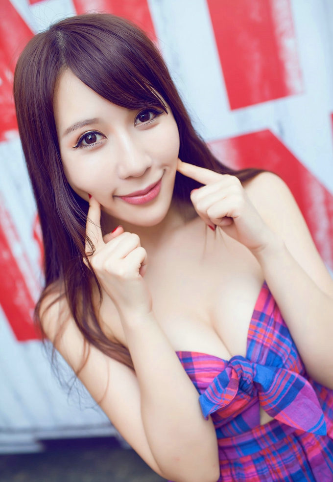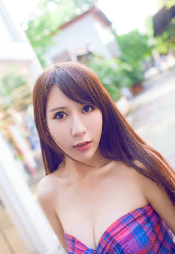 格子连衣裙抹胸爆乳诱惑白嫩模特艾惟女神气质风情写真