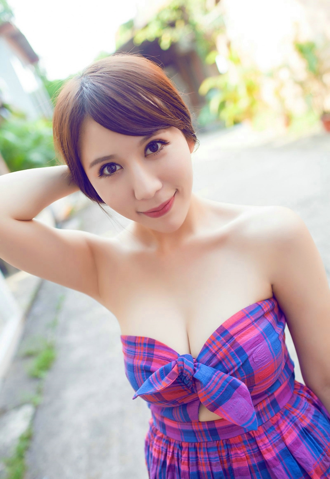 > 格子连衣裙抹胸爆乳诱惑白嫩模特艾惟女神气质风情写真